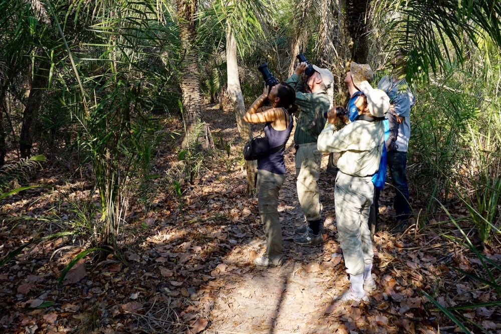 À noite, com o clima fresco, é chegada a hora de ir à busca de animais de hábitos noturnos. De olhos e ouvidos atentos, o guia utiliza um holofote...